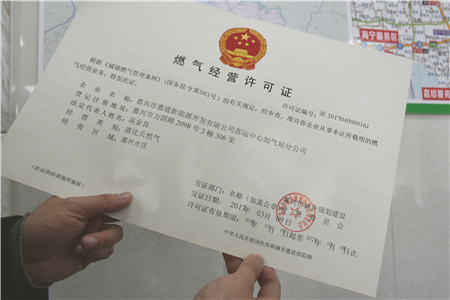 3月9日,嘉興客運(yùn)中心LNG加氣站正式獲得由嘉興市城鄉(xiāng)規(guī)劃建設(shè)管理委員會(huì)核發(fā)的“燃?xì)饨?jīng)營(yíng)許可證”,標(biāo)志著客運(yùn)中心LNG加氣站正式對(duì)外投入運(yùn)營(yíng),這也是嘉興市區(qū)范圍內(nèi)第一張LNG加氣站燃?xì)饨?jīng)營(yíng)許可證。